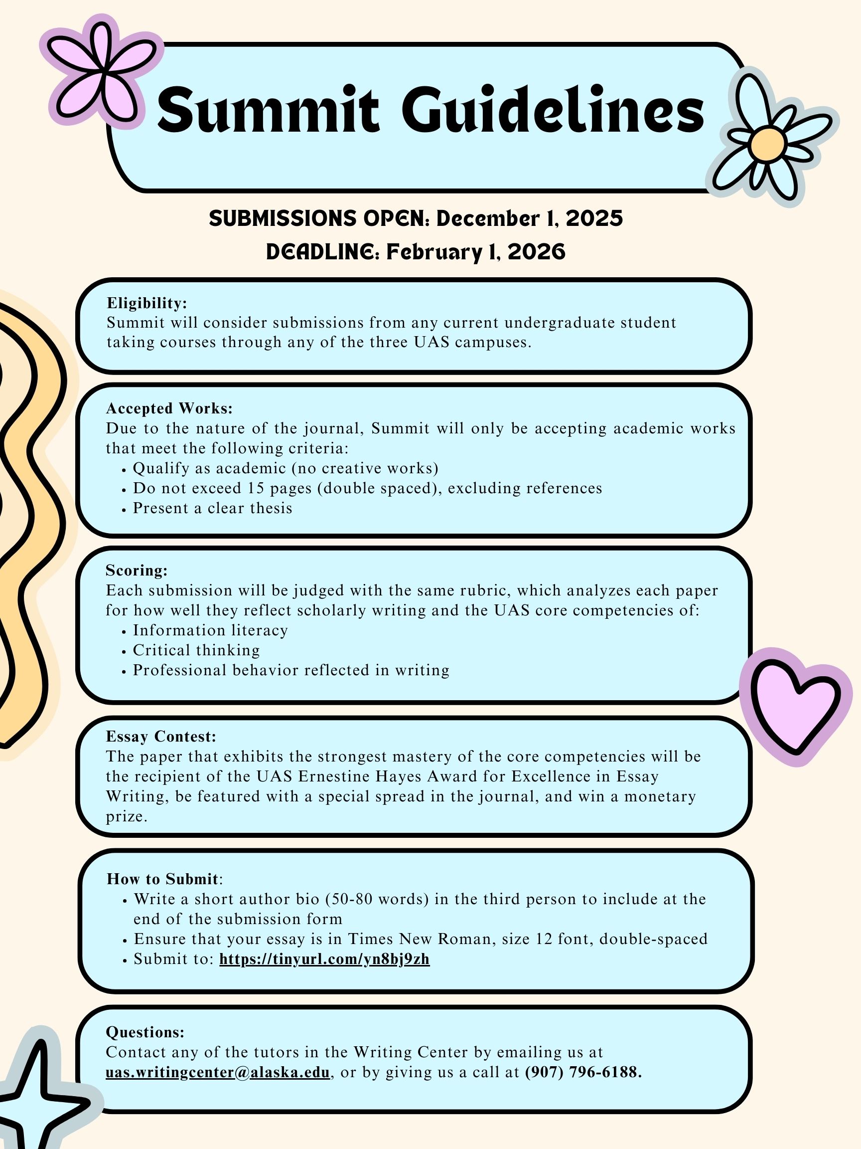 The submission form for next year's publication is open from Dec. 1, 2025, through Feb. 1, 2026. Please see below for full guidelines. Due to the nature of the journal, Summit will only be accepting academic works that